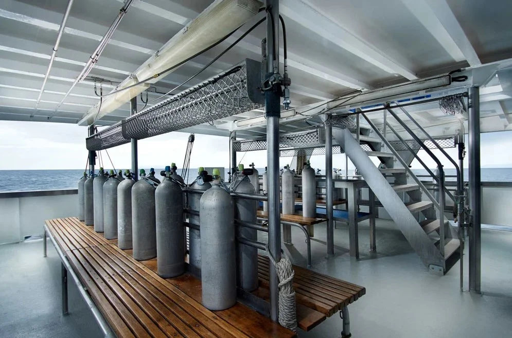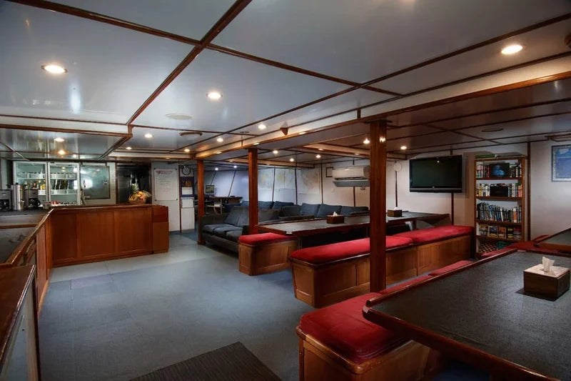 An incredibly spacious lounge and dining area is located on the main deck of the boat providing plenty of air-conditioned space to unwind and enjoy the on-board cuisine. An expansive dive deck leads perfectly to the dive platform, and also boasts a dedicated camera area for our photographer guests. Individual dive stations provide plenty of space and storage for your dive kit. This area also provides individual toilets, freshwater showers and rinse tanks for your equipment.