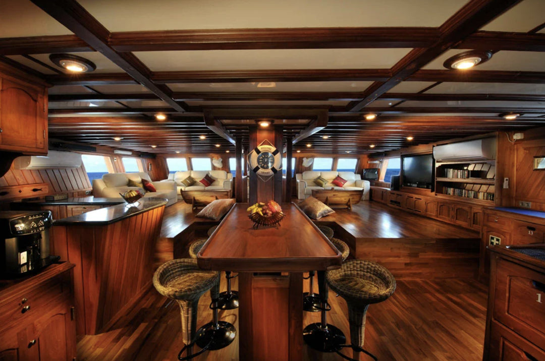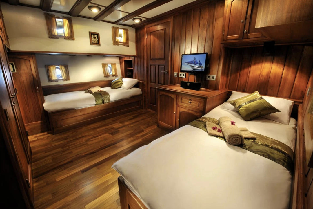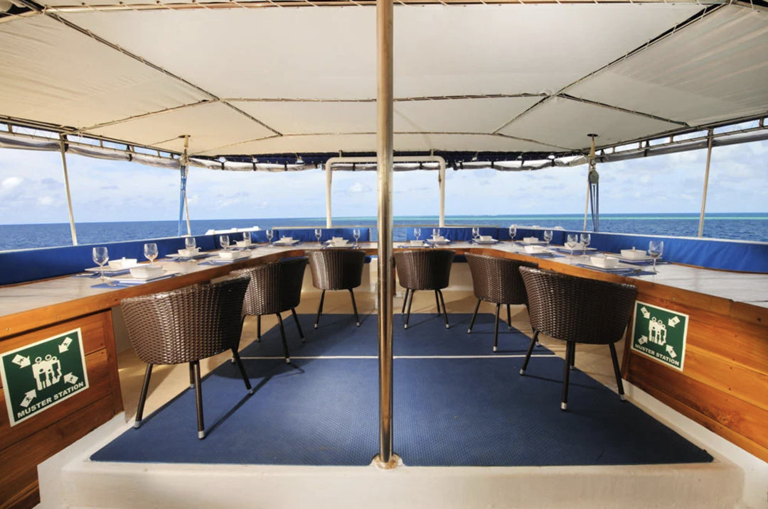 The 40m Palau Siren liveaboard was built on the Indonesian island of Sulawesi and is handcrafted from ironwood and teak (traditional to the area). Built by divers for divers, you can be rest assured that every need has been thought of and addressed.A maximum of 16 guests ensures ample space to relax pre and post-dive. The 8 guest cabins all have air-conditioning and private en suite bathrooms with hot water.The saloon also has designated areas for charging and preparation of your camera, lighting, and video equipment making the Siren a top choice for underwater photographers and videographers.